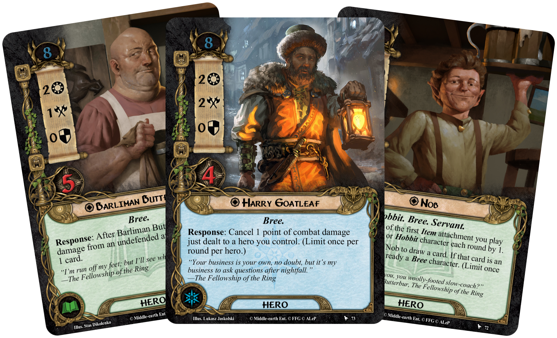 In addition to an exciting quest, The Gap of Rohan introduces three new heroes and ten new player cards to add to your collection. Taking inspiration from the passive nature of the townsfolk of Bree and the surrounding lands, many of the new Bree player cards help keep the other characters alive and healthy without taking much of an active part themselves. The tavern keeper of Bree, Barliman Butterbur [OotR 71], is ready to serve the the heroes of Middle-Earth along with his servant Nob [OotR 72] and the keeper of the western gate, Harry Goatleaf [OotR 73]. All of these new player cards provide a unique new archetype to experiment with.