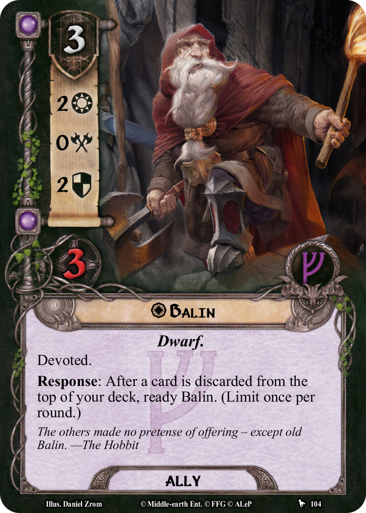 With the introduction of a Balin [OotR 104] ally, it is now possible to field all 13 dwarves of Thorin’s Company in a single deck. Sporting the Devoted keyword and with a conditional readying effect, this iteration of Balin is at his best among fellow dwarves. However, his flexible stat line may help him find a home in any company.
