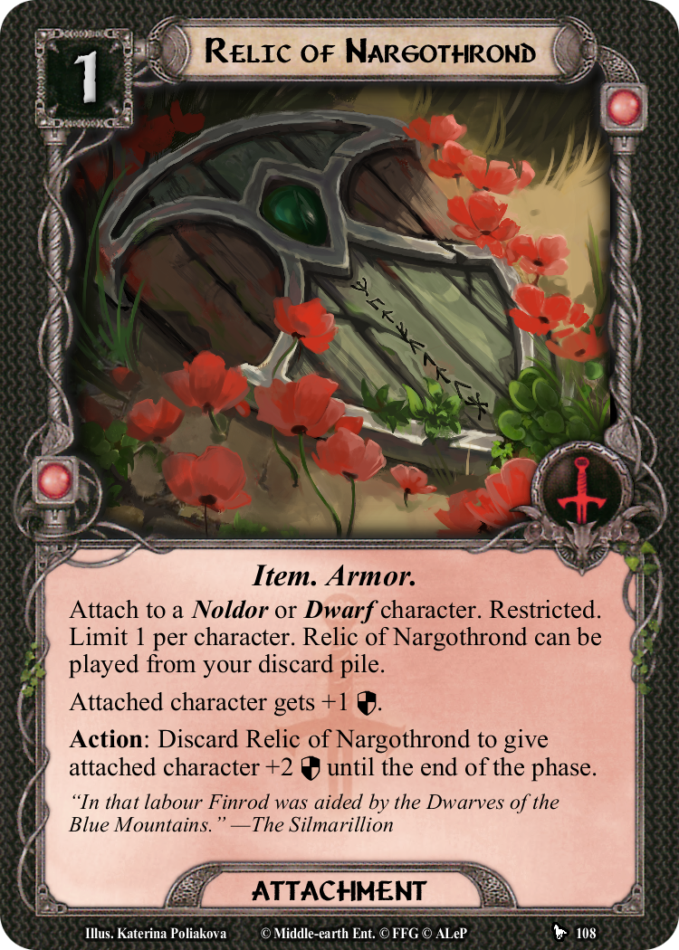 Great treasures can be found beneath the mountains, as every dwarf knows. A useful item for any Noldor or Dwarf character, this shield can be cast aside for a powerful temporary defense bonus – perfect for Gaeronel’s improvisational strategies. Because this relic can be played from the discard pile, it may be a useful tool for the dwarves who excavate it through mining as well.