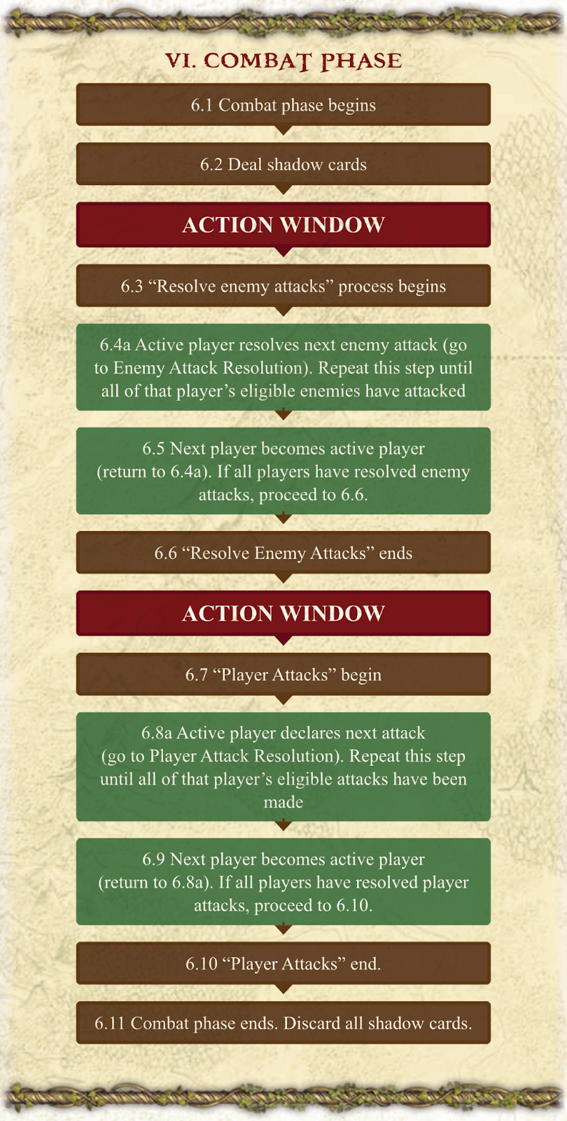 ALeP’s Note: With the release of the Rules Reference there were some changes to the Action Windows of the Combat Phase. On the one hand, this allowed players to do useful new things, like being able to play Meneldor’s Flight [SoM 76] in the Action Window between steps 6.8.3 and 6.8.4 of the Player Attack Resolution to save a Vassal of the Windlord [SoM 98] from being discarded by its own effect. On the other hand, there was no longer an Action Window between Steps 6.6 and 6.7 of the Combat Phase, which for example meant that, to be able to use the Action onWestfold Outrider [TVoI 6/RoR 6] to engage an enemy in the staging area during the Combat Phase without being attacked by that enemy, a solo player needed to be engaged with another enemy already.